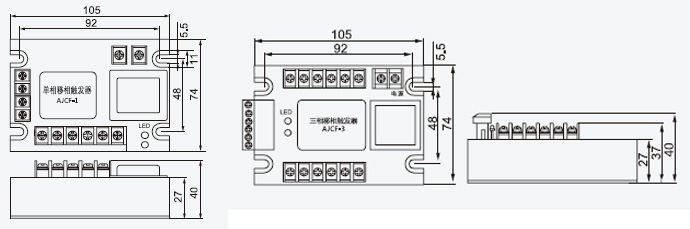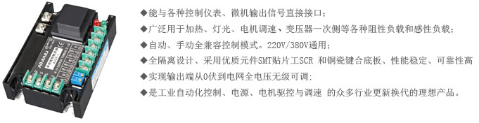 本公司生产的移相触发器有单相AJCF-1和三相AJCF-3两大系列,产品采用大规模集成电路设计,内部含同步检测信号、集移相控制电路、 触发驱动电路、RC阻容吸收电路及电源电路等于一体,在手动或自动调节的输入控制下,通过移相触发电路,可触发任何单向或双向可控硅, 实现了控制电路与可控硅主电路集成一体化,使模块具备了弱电控制强电的电力调控功能,达到改变可控硅导通角即可实现负载电压从0V到电网电压的无级可调。