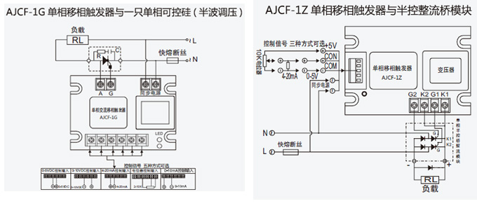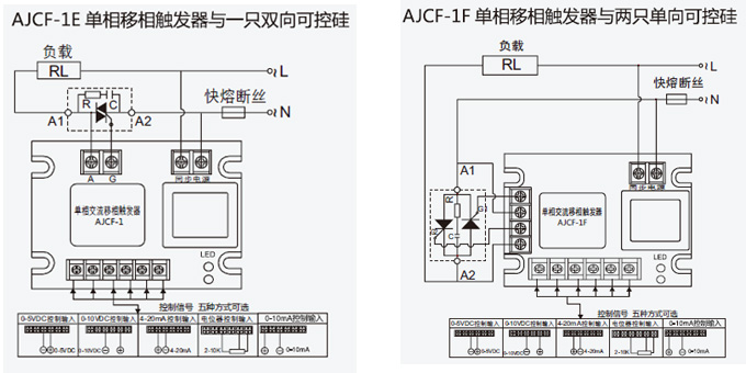 本公司生产的移相触发器为独特的全兼容输入控制模式,能适用于0-5VDC、1-5VDC、0-10VDC、2-10VDC、4-20mA、0-10mA等自动控制模式,可以用于各种仪表、温控仪、微机输出的模拟信号直接接口,也适用于2-10K/2W电位器手动调节,多功能输入信号,无须专门订制,大大降低了用户的选型难度。其中AJCF-1单相触发器为220V或380V通用型,特殊电压可向公司定制,同时具备延时和外控电压功能, 产品的"VR1"小电位器可限制输出最大值,在110V-电网电压值之间变化,"VR2"小电位器可调节缓启动延时时间,在0-10秒之间变化, 顺时针方向增大,逆时针方向减小。产品出厂时一般为零延时,用户需要自行调节。AJCF-1和AJCF-3在控制接线方式上存在区别,请勿接错, 影响输出。两者都需要提供外部电源,使用时请按说明书图示正确接线。