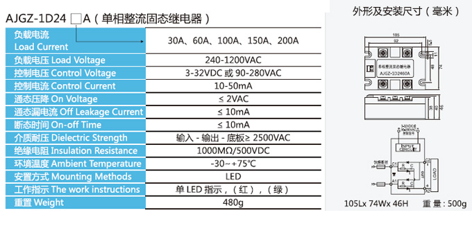 本公司生产的AJGX型SSR是采用国外先进技术和器件制造的一种开关性能优良的新型无触点电子开关器件。其输入端仅要求很小的控制电流,能与TTL、HTL、CMOS等集成电路较好地兼容;而输出回路则采用可控桂或大功率晶体管接通和断开负载电流。输入与输出之间采用光电耦合,通断没有可动接触部件,因此具有工作可靠、开关速度快、无噪音、寿命长、体积小、无火花、耐蚀防爆抗振等特点。目前已广泛应用于计算机外围接口设备、电炉加热恒温设备;数控机械、遥控系统、工业自动化装置;信号灯、交通灯、 照明舞台灯光控制设备;仪器仪表、 医疗器械、复印机、彩扩机、橡塑机械,自动洗衣机;另外在化工、 煤矿需防爆、防湿、防腐蚀场合中都有大量使用,已成为继电器家族(EMR) 的理想更新换代产品。