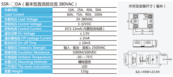 单相直流控制交流,输入控制电压3-32VDC ,电流6-15mA ,输出负载电压24-660VAC或1200VAC。