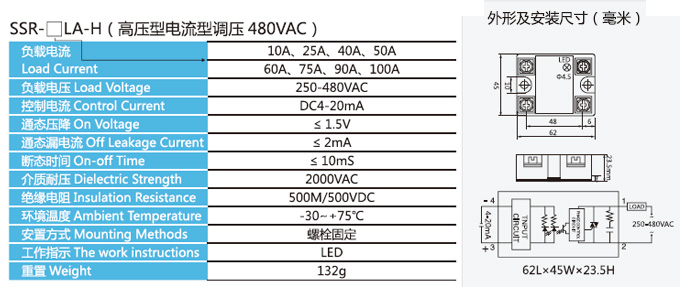 单相交流控制交流,输入控制电压90-250VAC ,电流6-20mA ,输出负载电压24-660VAC或1200VAC。
